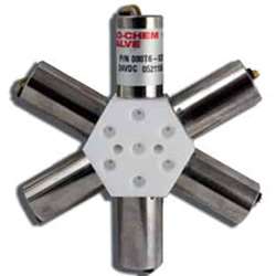 紧凑的阀/模组配置 Bio-Chem Fluidics分配阀可供三种阀门通径,采用0.38英寸(用于040T), 0.75 inch (080T) 和 1.00 (105T)英寸的螺线管壳体直径。孔直径范围从0.032英寸到0.125英寸,可满足各种各样的应用要求。为方便安装,全部入口均设在模组的同一侧。共同出口设在所有入口的中央。(注:在转向应用中,入口和出口是反的。)紧凑的模组结构确保内容积最小。
